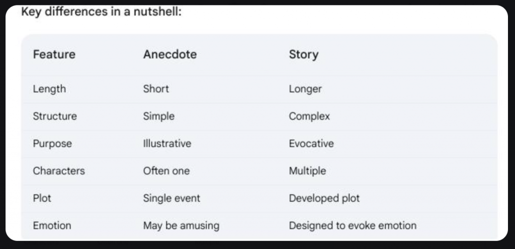 The terms “story” and “anecdote” are often used interchangeably, but they have distinct characteristics: